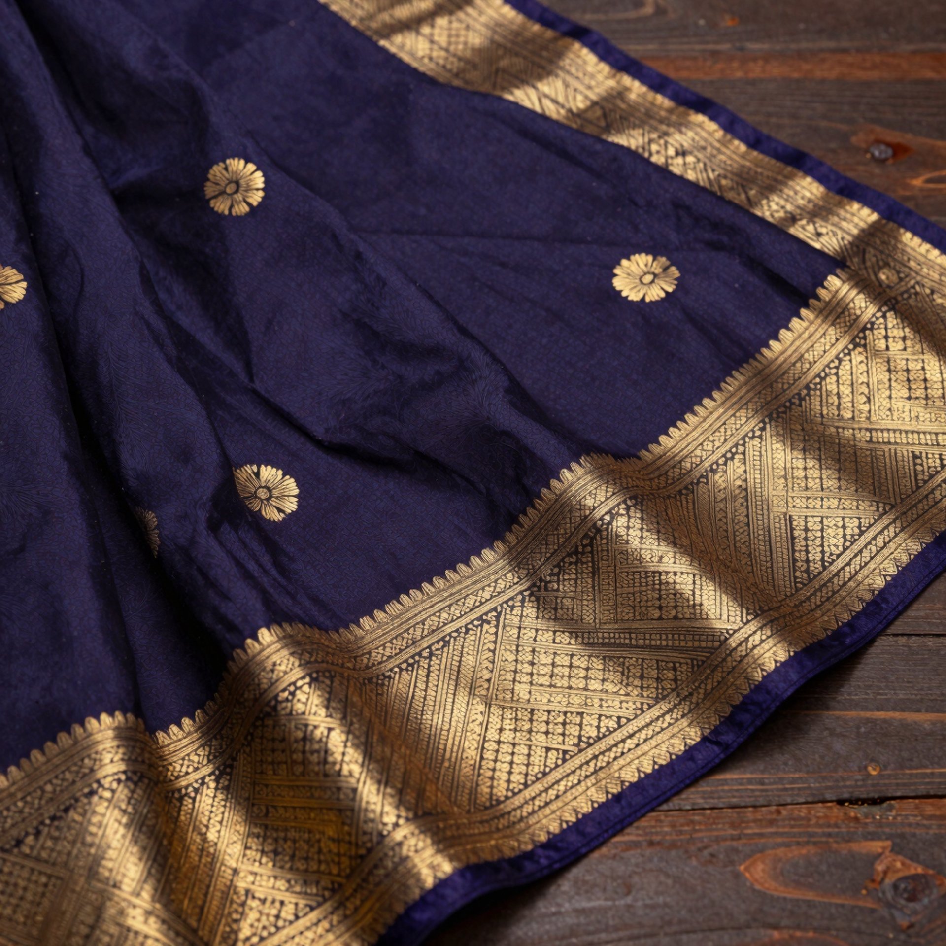 Pure zari is crafted using real silver coated with a layer of gold. It is highly durable and gives a luxurious finish, making it ideal for bridal and heritage sarees.